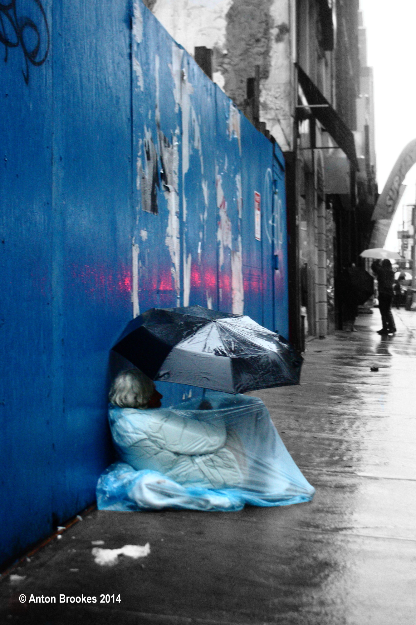 It is odd how we gravitate to the places that are familiar to us and we feel comfortable in regardless of the harsh conditions that ‘place’ may bring. For all of you who remember the ‘Small Change’ blog of July 2013 http://wp.me/p2mncz-lt, here’s an update. The rain was lashing along Lexington Avenue, sending shoppers scurrying for home and a dry change of clothes. All but one, Small Change was already ‘home’. Wrapped up in recycling bags against the rain and determined not to be washed away.